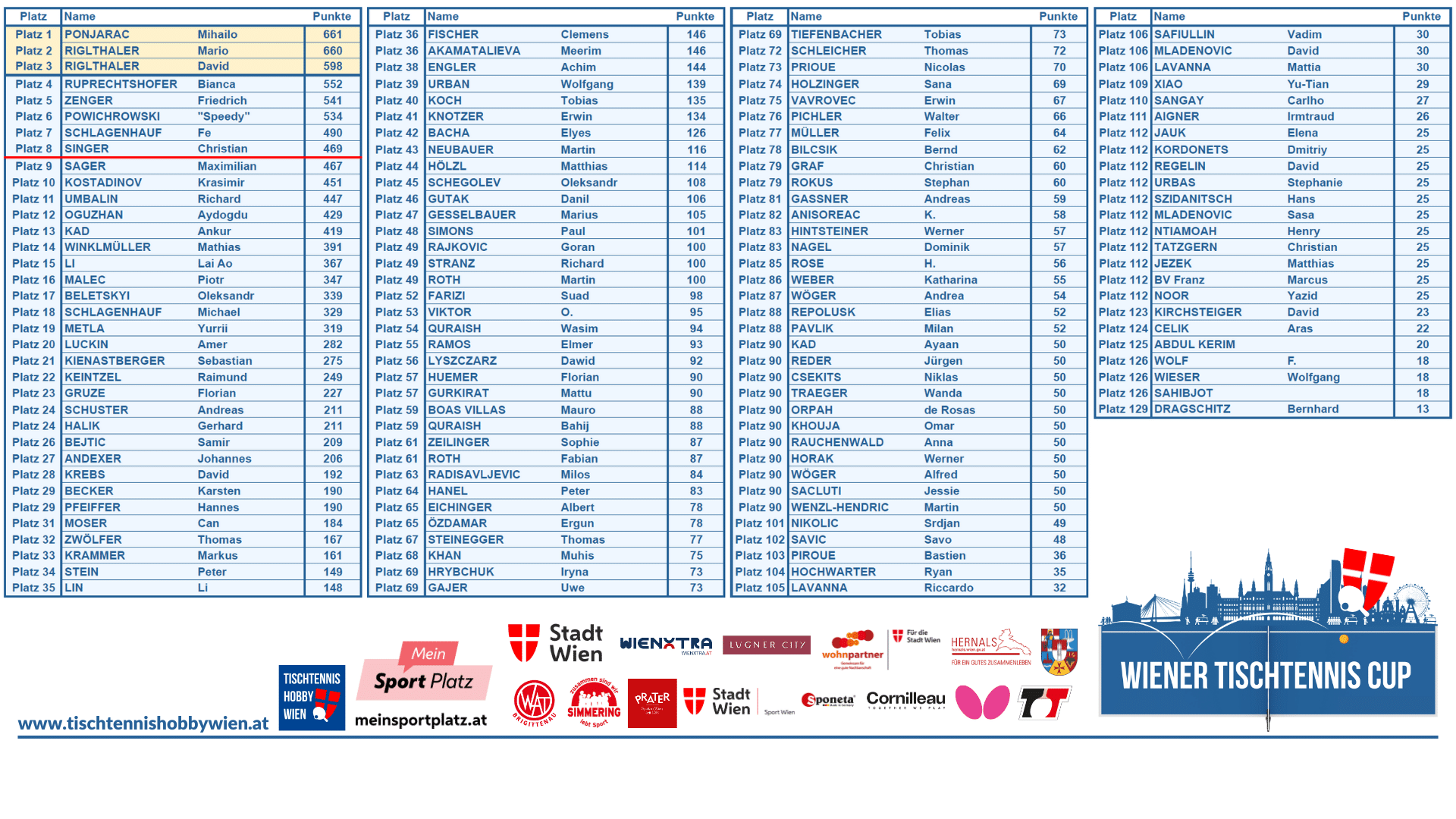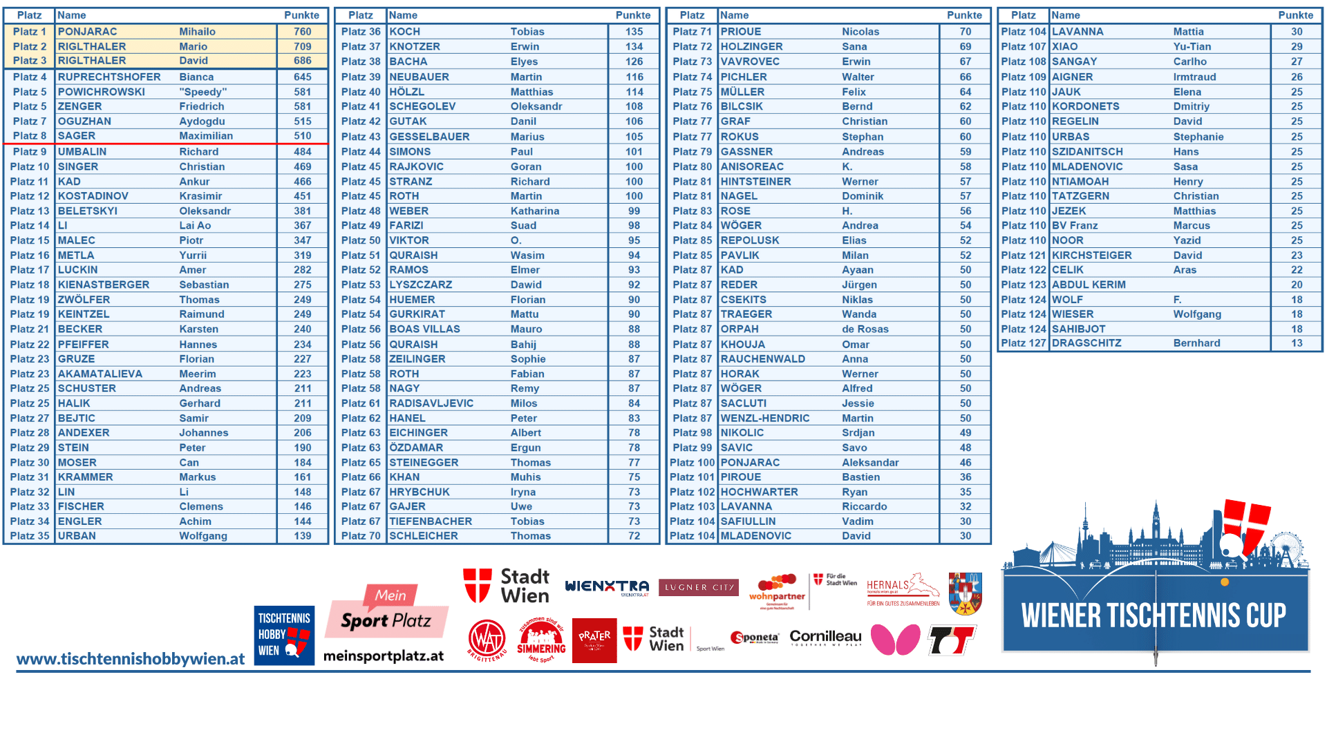 Regelmäßige Teilnahme am Wiener Tischtennis Cup wird mit Punkten belohnt, die in einer fortlaufend aktualisierten Tabelle auf dieser Webseite veröffentlicht werden. Am Ende der Turnierserie wird der Titel Wiener Tischtennis Cup Champion 2025 verliehen. Details zum Punktesystem gibt es im Regulativ ->